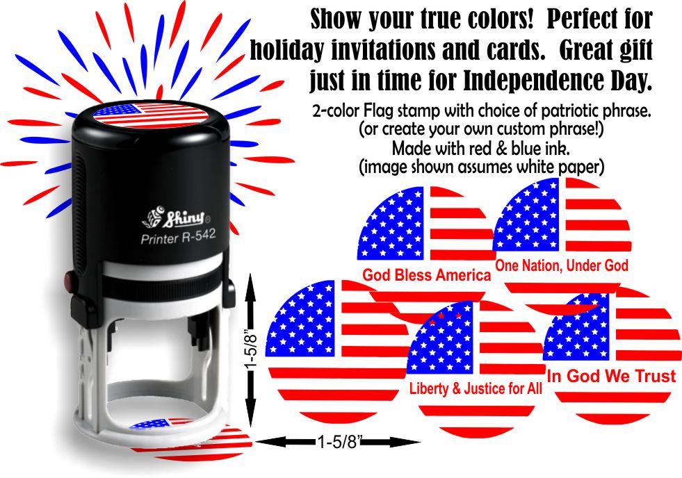 Show your true colors! Perfect for holiday invitations and cards. Great gift for any patriot. Built in pad contains red and blue water based ink which dries well on any "porous" (non-coated) surface. 2-color pad reinks easily with any water based stamp ink.