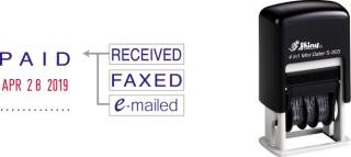 Printer line mini date stamp with 4 interchangeable rubber text dies. The rubber dies have a double-sided tape backing and are ready for peel & stick installation. Font size is 1/8" tall. Comes preinstalled with your choice of upper Text Plate: (1)PAID, (2)RECEIVED, (3)FAXED or (4)e-mailed. Bottom plate can be left blank or ordered with a dotted-line initial box.